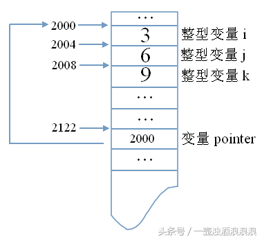 如图,变量pointer存储在内存中起始地址2122的位置,值为2000,即存放的地址编号为2000,也就是变量i的起始地址,通常我们称变量pointer为指向变量i的指针变量。同样,变量i在内存中的起始位置为2000,其存放的是地址编号3,而地址编号3又指向另一个变量的起始地址。