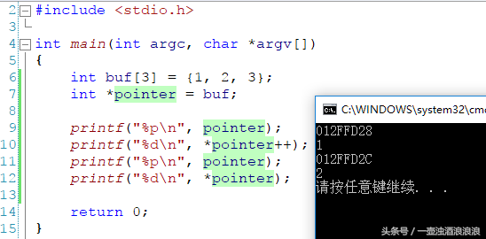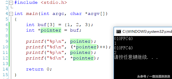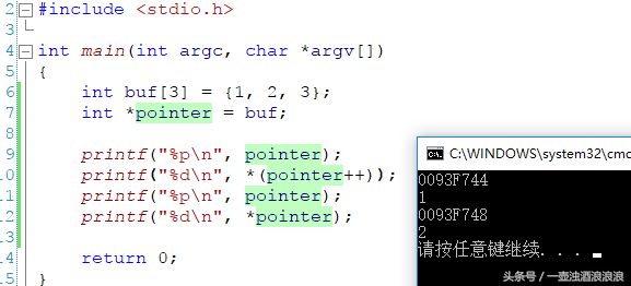 说明:*pointer++,pointer指向buf[0],由于*、++是统一优先级且他们的结合性从右至左,即先执行pointer++,但是对于pointer++来说是先用后加,所以先取pointer所指向的地址空间的值1(buf[0]),再执行pointer++操作,即pointer指向地址后移4字节(因为pointer为int *型,其所指向地址空间存放的是int型数据,所以后移4字节而不是1字节),此时pointer指向buf[1], 即pointer所指向地址空间的值为2(buf[1])。