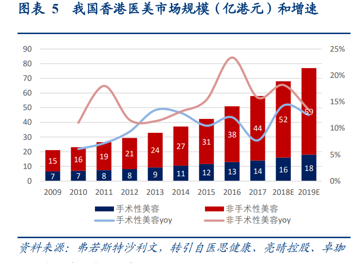 根据弗若斯特沙利文的数据,我国香港地区医美市场规模从 2009 年的 21 亿港元成长到 2017 年的 59 亿港元(预计 2019 年约 77 亿港元),翻了近 2 倍,CARG 约 13.7%,其中 手术性和非手术性美容分别 14 亿、44 亿港元,分别占比 23.7%和 74.6%,2015 年后非手 术医美的增速高于手术性医美。非手术性医美中以能量仪器、微创疗程为主,分别占香 港医美市场的 52.5%、16.9%。我国香港每名医美客户的年均开支也从 2011 年的 3637 港 元增至 2017 年的 7272 港元。