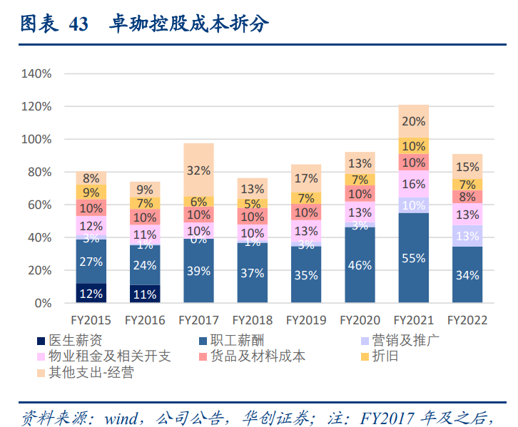 财务模型比较: 三家公司运营模式已经比较成熟,人力(包括注册医生)约占收入比重的 35~40%(以下 比例均指占收入百分比)、物业租金 10~13%、折摊 3~10%、医疗耗材等货物成本 8~13%、 营销费用 1~10%、其他(包括行政费用)6~12%。 对医生的依赖程度:FY2019 年之前(7 成是医美业务)医思健康医生支出相对稳定在 8%, 对医生的依赖程度低于卓珈控股,但高于亮晴控股,因亮晴控股业务更偏向能量仪 器的轻医美,医生聘用采用顾问形式,并非全职,医生疗程次数低,主要依靠已受培训 的调节师(亮晴控股医生疗程比例约 4%、医生疗程服务收益约占总收入 15%)