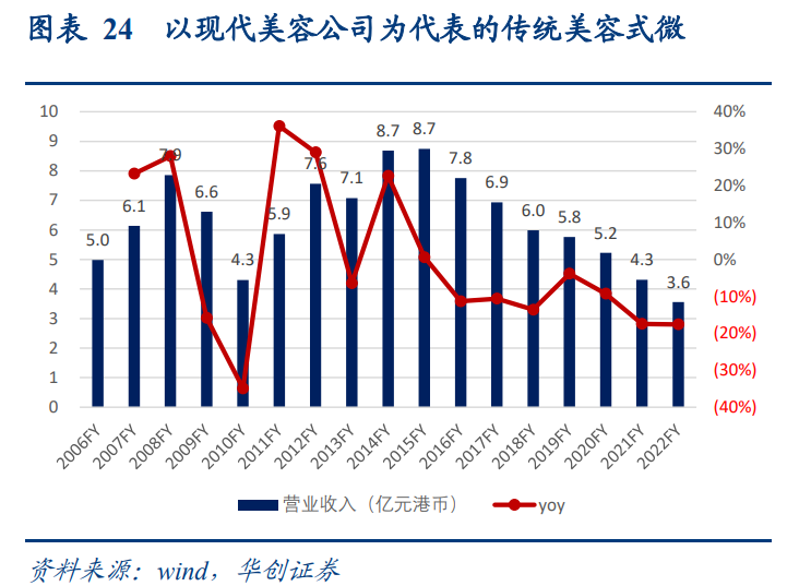 2012 年香港爆发了一起医美市场为严重的细菌感染个案,终 3 名求美者 1 死、1 截 肢、1 伤残,香港政府于 2012 年 10 月成立“私营医疗机构规管检讨督导委员会”和“区 分医疗程序和医学美容服务工作小组”来加强对医美的监管,2013 年 11 月督导委员会接 纳工作小组的报告,确定了某些高风险的医美程序必须由注册医生来执行,并且印刷了 《美容程序小册子》和《只应由注册医生/注册牙医施行的美容程序》来提高公众对医美 程序的认知,由此香港医美机构的合规监管正式拉开帷幕,合规医美机构的门槛被抬高。 伴随着大众对即时医美的需求更旺,以及传统美容的竞争过于激烈(香港美容美体护理 机构约 1 万家),以“现代美容”为代表的传统美容开始式微(现代美容主要做传统美容、 水疗、按摩等业务)。
