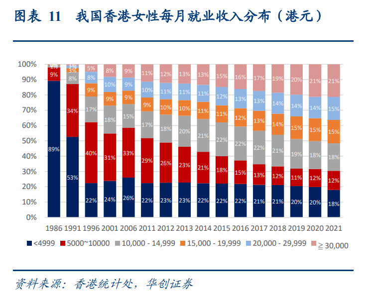 2) 发达的服务业:2000 年初香港已经具备有医美消费能力的人群基础。2001 年,我国 香港女性每月就业收入超 1 万港币的群体已经达到约 45%,奠定了有消费能力的人 群基础,2012 年女性就业人士的每月收入中位数也已经达到 1 万港币,2015 年和 2021 年女性中超 1 万港币的比例持续提升至 60%、70%,2021 年超 3 万港币月收入的女 性占比达到 21.4%。2001 年,亚洲金融危机修复后,伴随着收入水平的提升、高收 入女性占比的提升,香港在个人护理的消费支出增速也高于整体,同时受日本、 韩国和我国台湾地区的影响,消费者对医美的认知度在不断提升。