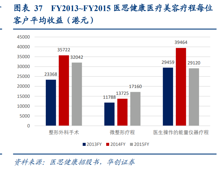 运营能力:高端定价。医美产品的销售一般覆盖多疗程,医美业务收益来自预付套餐的 销售和履约,医思健康定位高端医美,客户年均消费超 2.5 万港元,高于整体,分 产品来看,整形外科手术和医生操作的能量仪器疗程年均消费相对较高,FY2015 年约 3 万港元。