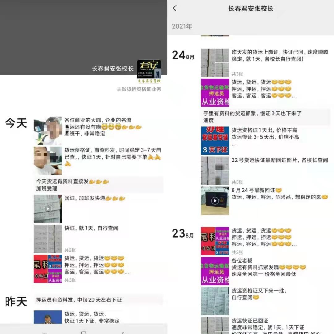 “各位校长、实力中介,货运上岗证,稳定,快证1天出,慢证7天左右……信息随时上传,国网查询,假一赔十……”2021年8月20日,“长春君安张校长”在其朋友圈发布了新一期短视频,招揽生意。