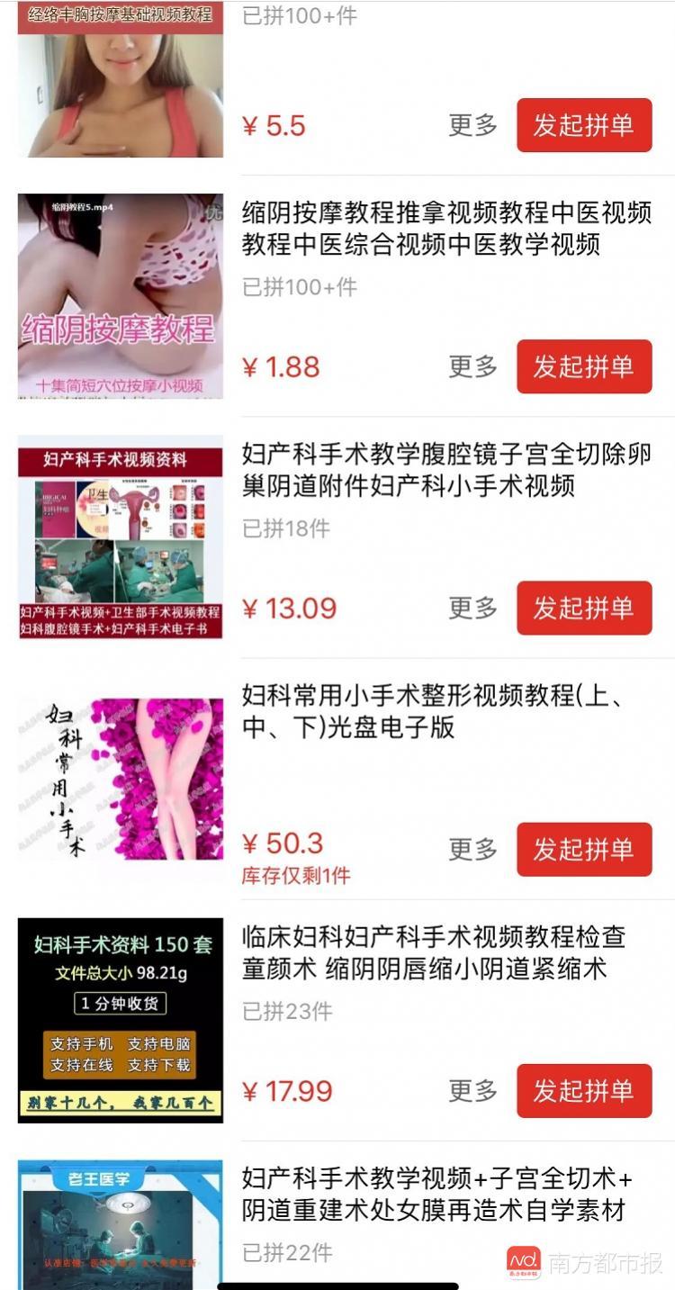 3月9日,南都记者接到读者报料,称其它平台亦有此类情况。在拼多多上,记者以“妇科视频”、“真人按摩视频”为关键词搜索,出现一些商家出售妇科手术、私密部位按摩等视频,有商家使用“无水印”、“你懂得”等字眼进行诱导性宣传,内容暴露、血腥。对此,拼多多客服向南都记者表示,对于平台禁止销售的商品,核实后会进行严肃处理。