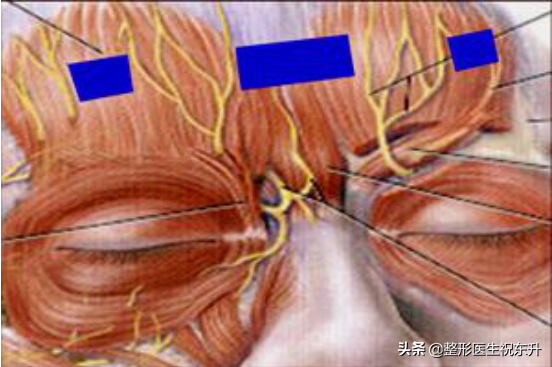 2、切断外侧的皱眉肌时,注意保护眶上血管神经束,后者邻近皱后肌的抵止点。然后,在眶上缘水平以上的额肌处,纵、横切断帽状腱膜和额肌,注意避开眶上血管神经束。