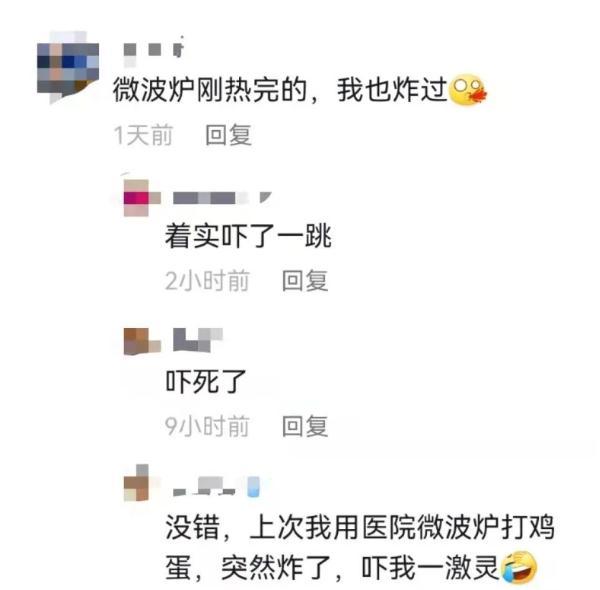 该视频在互联网上引起网友热议,网友纷纷留言调侃,“是鸡蛋还是炸弹”“这是炸蛋”,也有网友表示自己也遇见过“炸蛋”,“微波炉刚热完,我也炸过”“上次我用医院微波炉打鸡蛋,突然炸了,吓我一激灵”,更有网友对此类情况表示担心,“还好戴了眼镜,不然炸眼睛里了”。