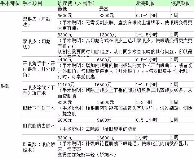 双眼皮(切开法):150~200万,时长1小时30分,术后有少量红肿和淤青,需要拆线,5日内不可水洗脸。
