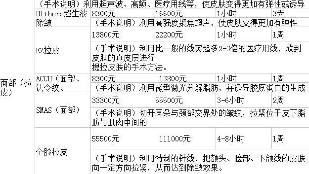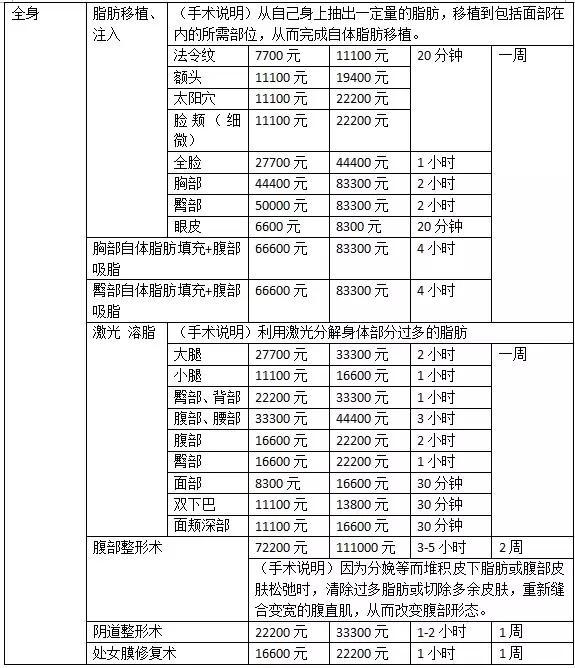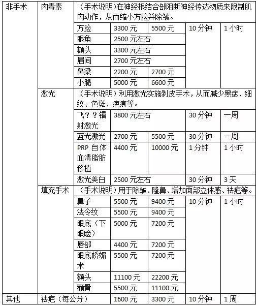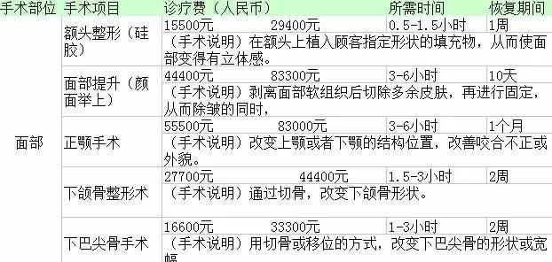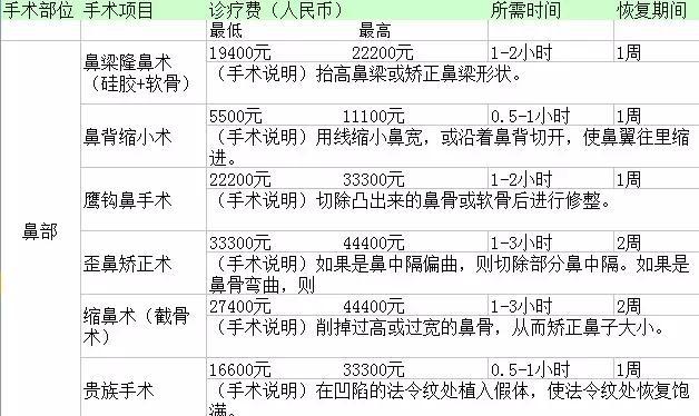 整形手术的价格都是不相同的,因为自身条件、医生资历等等,都会存在不小的差异,所以选择整形医院尤为重要。可以确定的是整形医院从以下两点来判断:标准一:看资质。整形医院卫生部标准由高到低分为:整形美容医院、门诊部、诊所。级别越高,标准越严格。标准二:看专家。求美者去任何医学整形美容机构就诊,应先确认相应医生专业资质:《医师资格证》《执业医师证》,建议综合考察,谨慎选择。以下是韩国整形美容主流手术项目价格表(单位是韩元,一元人民币大约是180韩元):