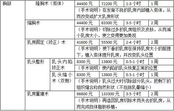 隆胸:600~1000万,时长2小时,术后有红肿和痛症,胸部需缠绕绷带,腋下需拆线,术后无影响可简单洗漱。