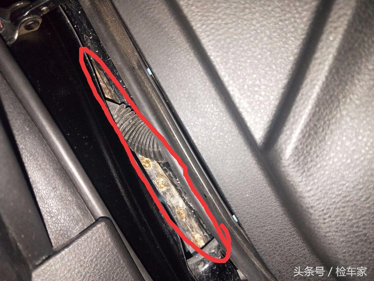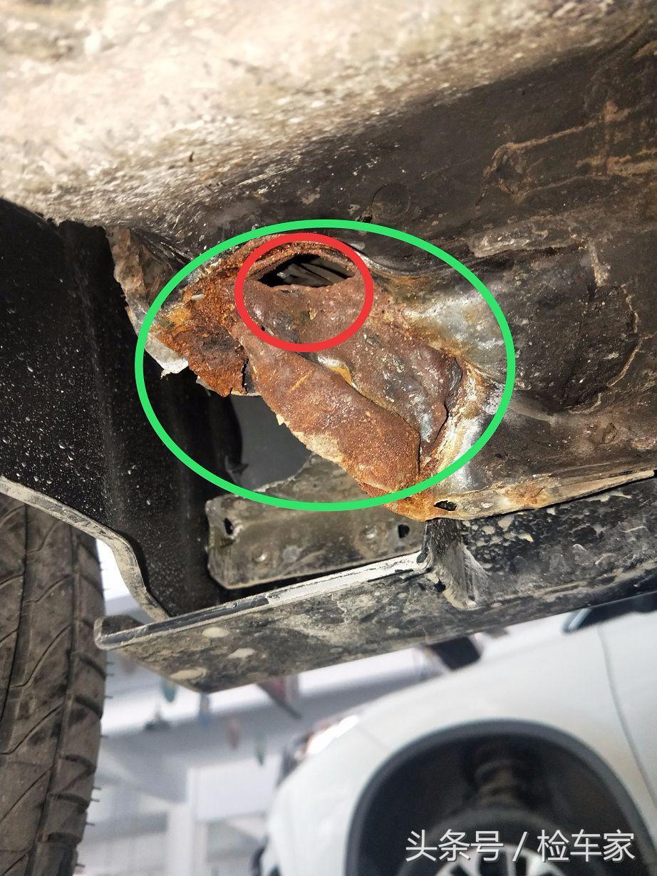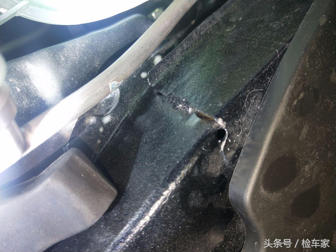 检测地板发现右侧大梁底部由于当时碰撞力度过大边缘开裂亏缩,这都没给维修,说实话小编修车10多年,虽然不是做钣金的,但是修事故车还是需要机修工去配合拆解,从未见过大梁地板开裂都不给人修复的,况且还是4S店,这种维修完全就是不负责任,生锈部开洞部位起码得也得给人整出来呀况且还是大梁啊,那么一大窟窿下雨天或是走个水路水罐进去内部铁梁就会生锈腐蚀后果不堪设想,难道这不是重大隐患吗?真的太不可理喻这种维修的态度了。