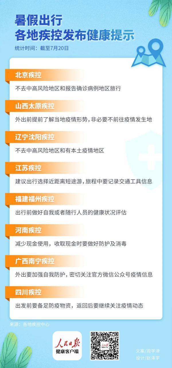 正值暑假期间,还能出游吗?人民日报健康客户端梳理了各地疾控新发布的暑假出行健康提示。③