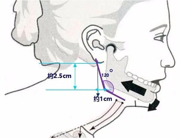 和谐的下颌角形态应该轮廓清晰,耳垂至下颌角的垂直距离2.5cm左右,下颌角点在耳垂至下颌角垂线前方约1cm左右;下颌缘与下颌升支成角约120°左右。