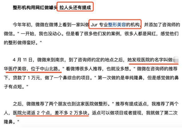 在这条新闻里,受害者微微还得到JUR的承诺,拉一个人过来整形,可以提点2万块。