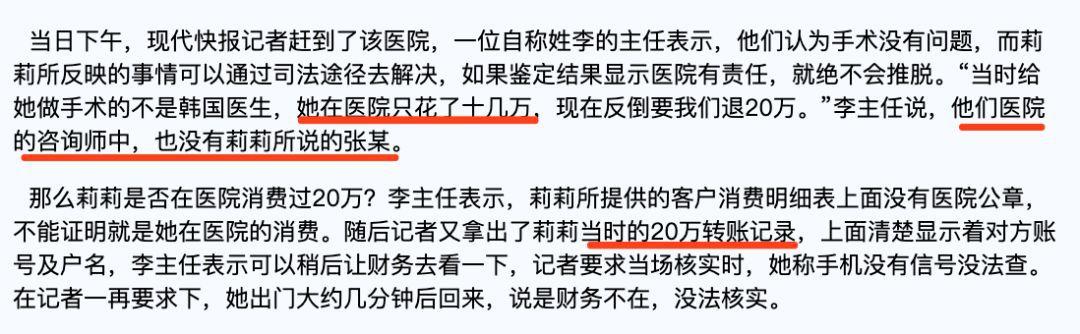 新闻里说,明明莉莉花了20万,但事后整形医院称只收到十几万,那么中间消失的几万元差额,则很可能就是被JUR团队的抽走了。