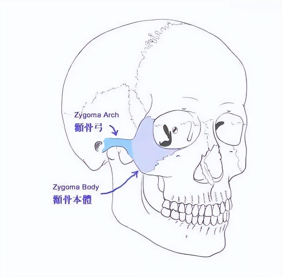 颧位于眼眶外下方,呈菱形。颧骨连接额骨、眼眶、上颌骨,向后则连接颞骨,构成我们所熟知的颧弓。
