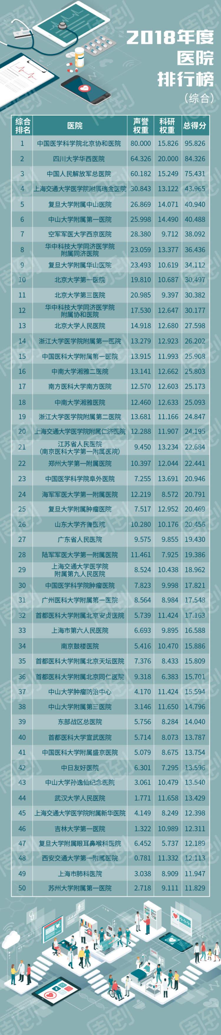 北京协和医院、四川大学华西医院和中国人民解放军总医院继续名列排行榜前三甲。
