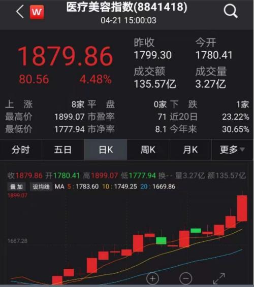 对于近期医美板块大涨的原因,有分析指出,一季度业绩超预期很可能是一大重要原因。一季度,医疗服务、医美恢复,在疫情期间压抑的需求释放、习惯和观念变化催生的需求增加等,带来医疗服务、医美消费的快速增长。此外医美产业作为消费升级新赛道,备受资本市场青睐。
