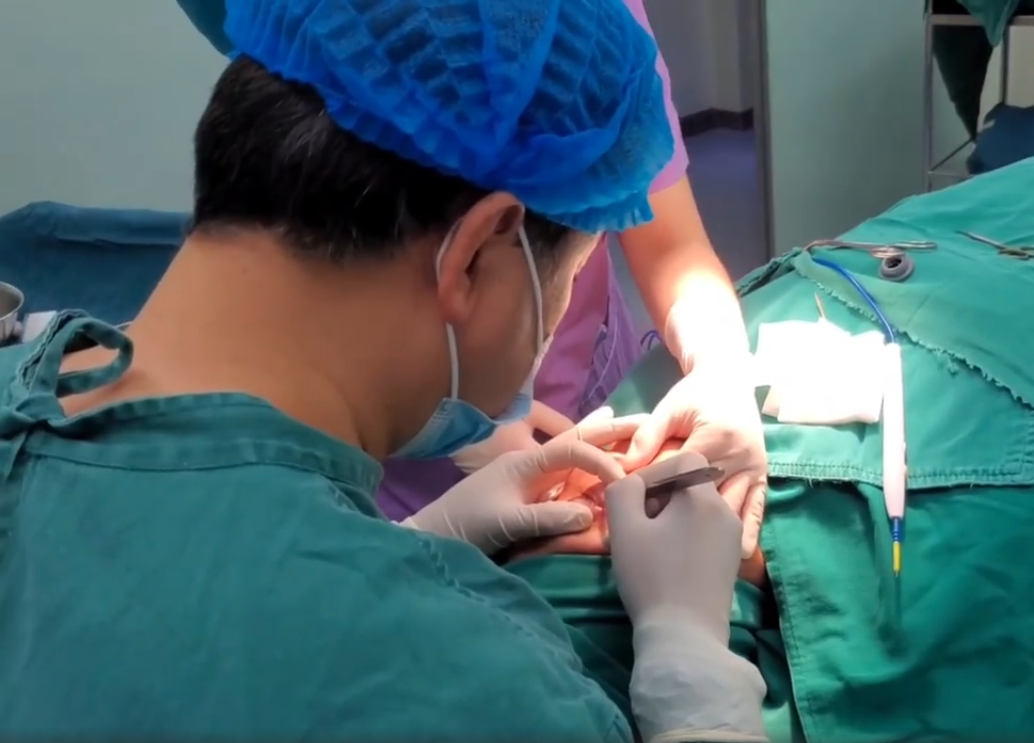 去除外侧和内侧的脂肪团,用纱布小心浸蘸止血,避免损伤内侧眶隔脂肪团中的细小血管。术中会不时的嘱咐求美者将眼睛睁大并张嘴,方便看清下眼睑内部情况。