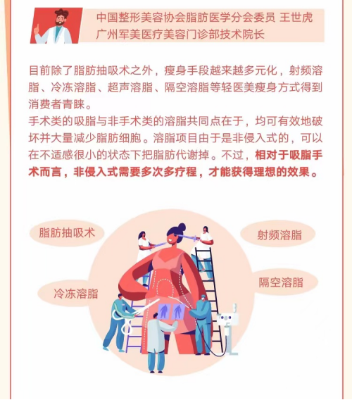 目前除了脂肪抽吸术之外,瘦身手段越来越多元化,不过在消费前,中国整形美容协会脂肪医学分会委员、广州军美医疗美容门诊部技术院长王世虎提醒消费者,应先进行技术摸底,根据个人需求选择医美项目。