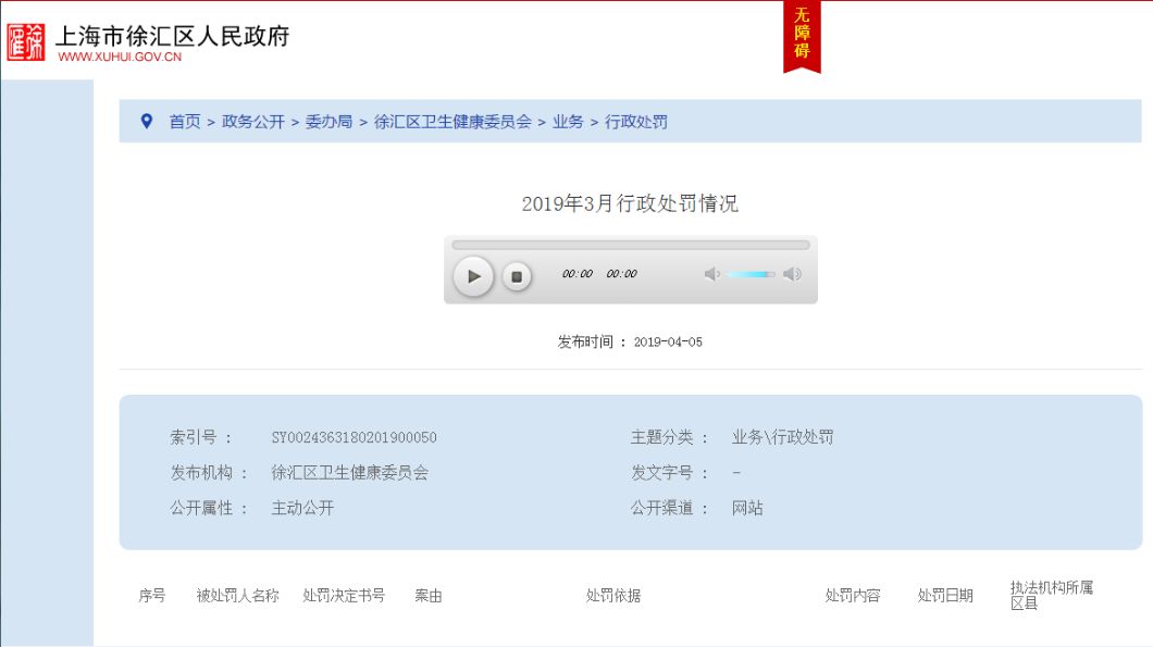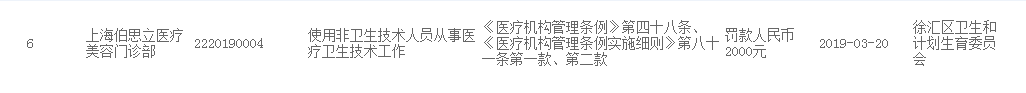 美颖认为,自己遭到了医院的欺骗。深思熟虑之后,美颖就此问题向徐汇区卫生监督管理局(简称卫健委)进行了投诉。徐汇区卫生健康委员会对上海伯思立医疗美容门诊部进行了处罚,并在于4月5日在徐汇区人民政府官网公开发布了2019年3月《行政处罚情况》。《行政处罚情况》中明确显示,上海伯思立医疗美容门诊部因“使用非卫生技术人员从事医疗卫生技术工作”被罚款2000元。