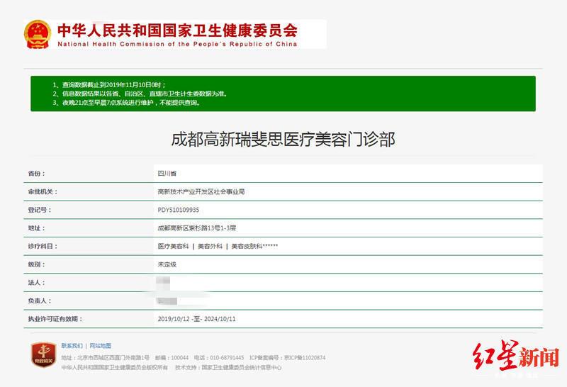 另外,记者在中华人民共和国卫生健康委员会网站上查询到,该机构在2019年10月12日取得《医疗机构执业许可证》,许可的诊疗科目为医疗美容科、美容外科、美容皮肤科。