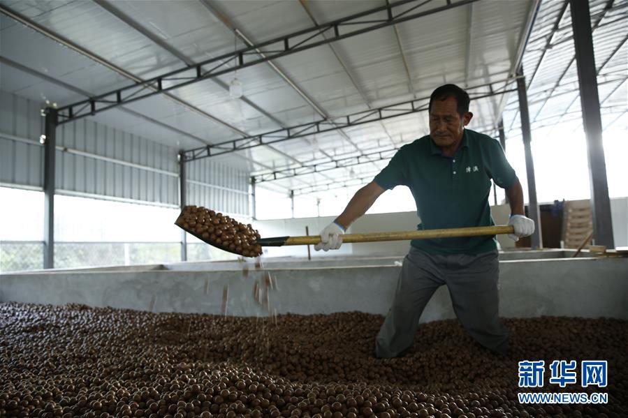 云南省临沧市永德县大雪山乡兴塘村村民毕家富在加工厂内翻晒澳洲坚果(2019年10月23日摄)。新华社发