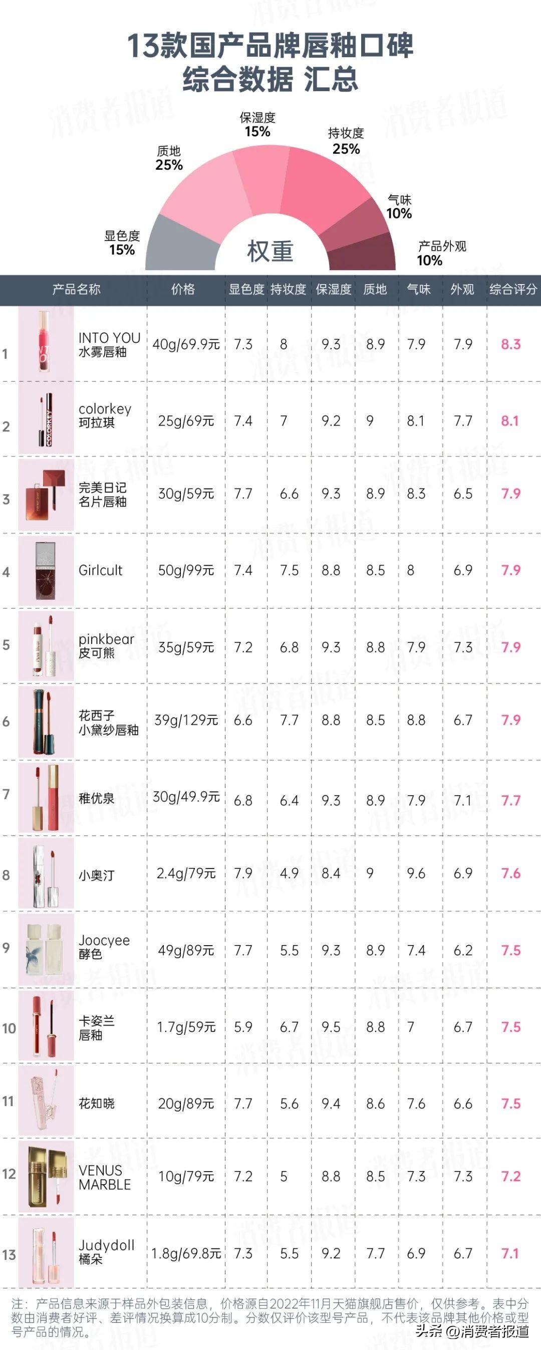 口碑结果显示,13款热销海外唇釉中评分不分伯仲,各有出彩点。消道长根据以上6个维度评价指标选出了表现较好的前2款唇釉分别是:INTO YOU水雾唇釉 8.3分 、colorkey珂拉琪 8.1分;而总评分低的两款是:Judydoll橘朵 7.1分、VENUS MARBLE 7.2分。
