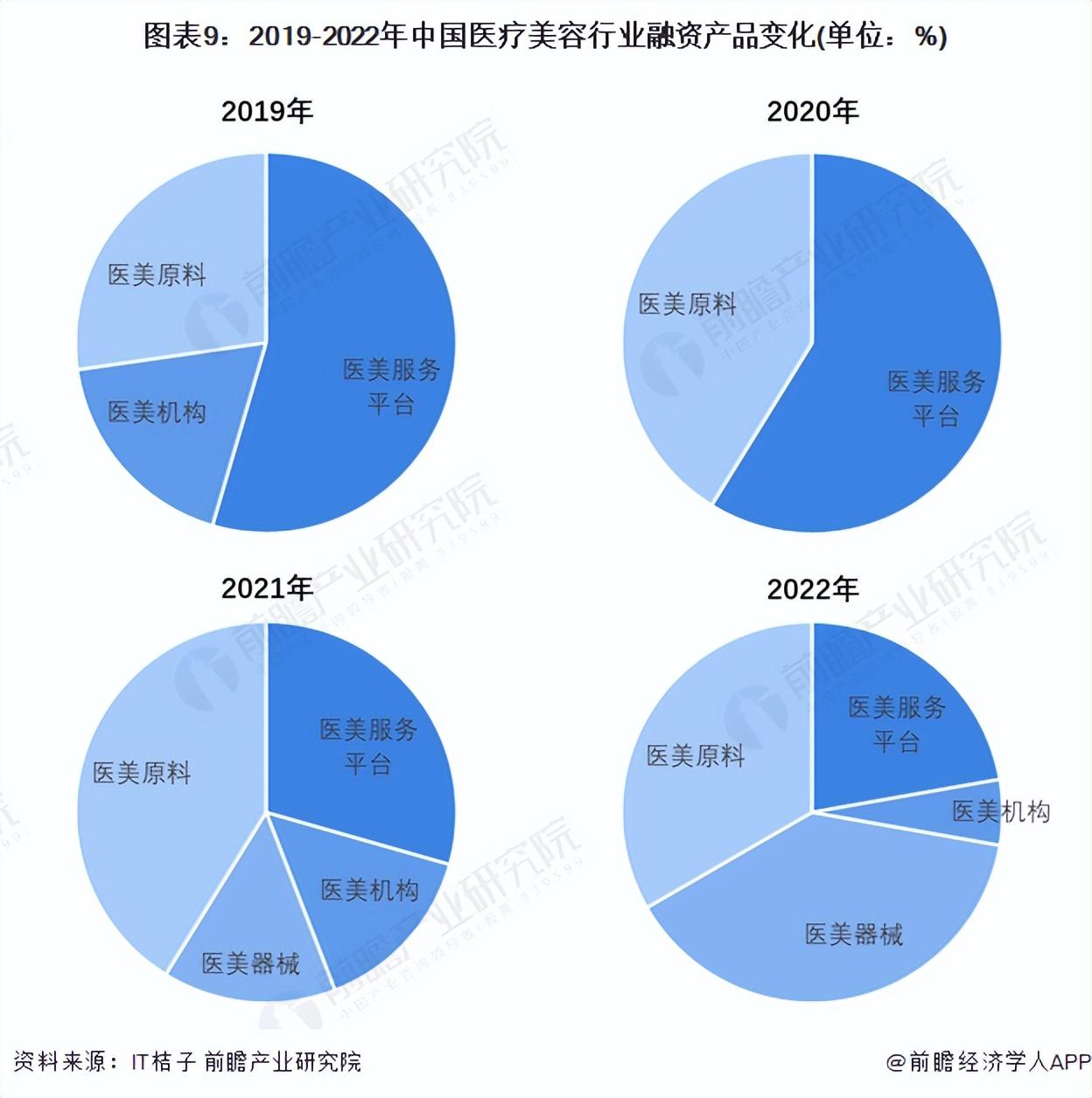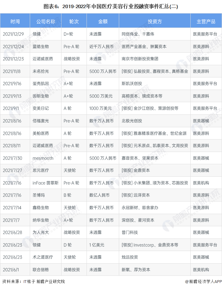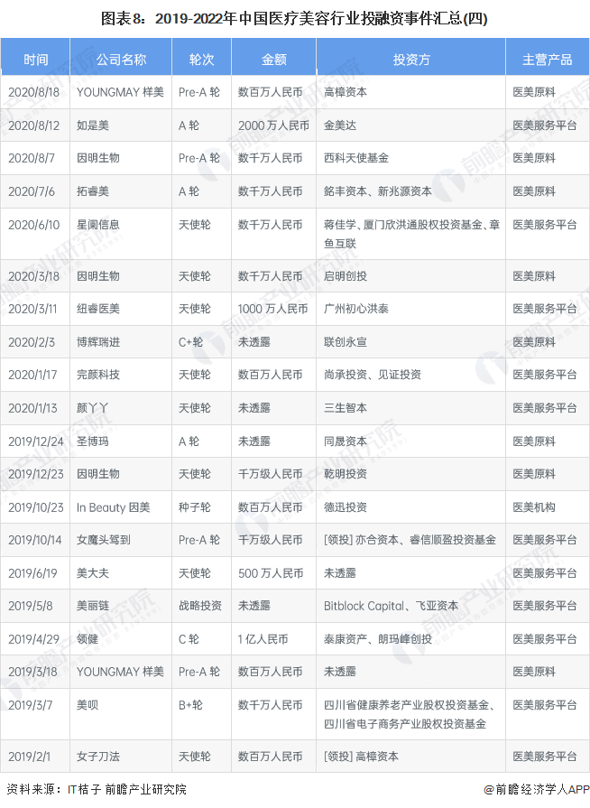 从2019-2022年融资企业的主营产品分析,投资热点从2019-2020年的医美服务平台和医美机构,逐渐变化到2021-2022年的医美原料或器械。