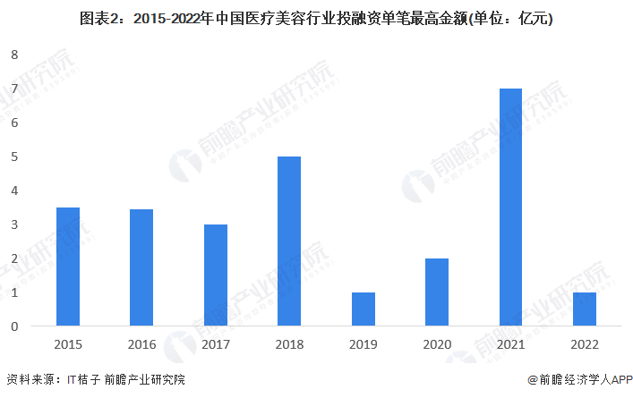 从单笔融资金额来看,除2018年和2021年单笔融资金额上升到5亿元以上以外,其他年份的单笔融资金额均为超过4亿元。2021年,单笔融资金额高,达7亿元;2022年中国医疗美容行业投融资单笔高金额为1亿元。