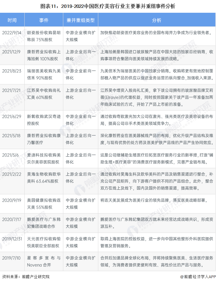 近年来,中国医疗美容行业发生的兼并重组事件多出于多元化经营、上游企业后向一体化、中游企业扩大规模等目的,例如朗姿股份继续收购整形医院标的,提高医美产业布局;新氧收购奇致激光,拓宽产业链布局,增加公司非手术类医美产品供给。2019-2022中国医疗美容行业主要兼并重组事件汇总分析如下: