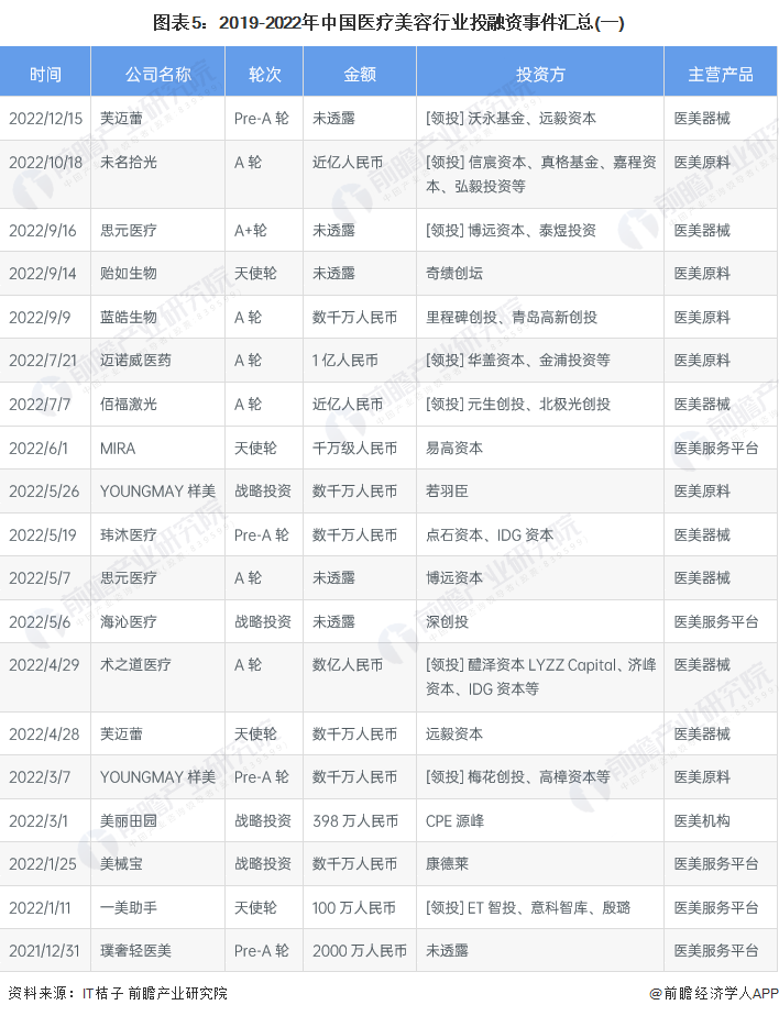 2019-2022年中国医疗美容行业的主要投融资事件如下: