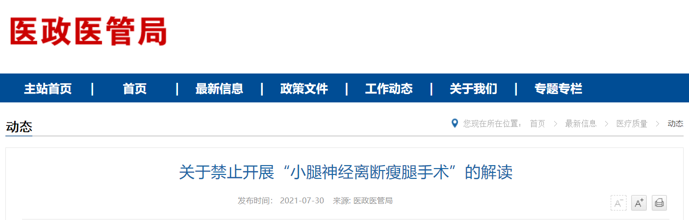 7月30日,卫健委办公厅连发两条关于禁止开展“小腿神经离断瘦腿手术”的通知。其中明确,该手术缺乏科学依据和循证医学证据,直接导致神经不可逆损伤和下肢运动功能障碍,存在严重性问题,有悖于医学伦理原则。因此自通知印发之日起,禁止“小腿神经离断瘦腿手术”应用于临床。