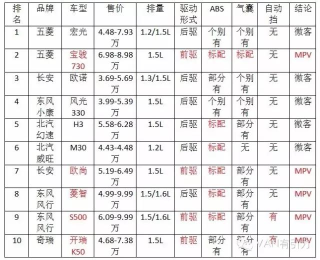 瞧,即便抛开舒适性之类的指标不谈,符合MPV定义的车型也只有一半(标红的)!至于五菱宏光、长安欧诺、风光330、幻速H3和威旺M30,坦白说确实比纯微面先进了不少,VAN哥觉得可以赐个“准MPV”封号以资鼓励嘛。