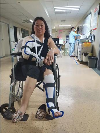 陈女士:“左脚有三处骨折,右手肩膀脱臼了。我要求医生给我打麻药,他们说打麻药对我恢复不太好,然后就没有打麻药,两个医生一个人把我的手拿着,一个医生使劲推我的手臂,直接把我的手臂用很大的力给推进去了,把它推归位。那种感觉真的是撕心裂肺。”