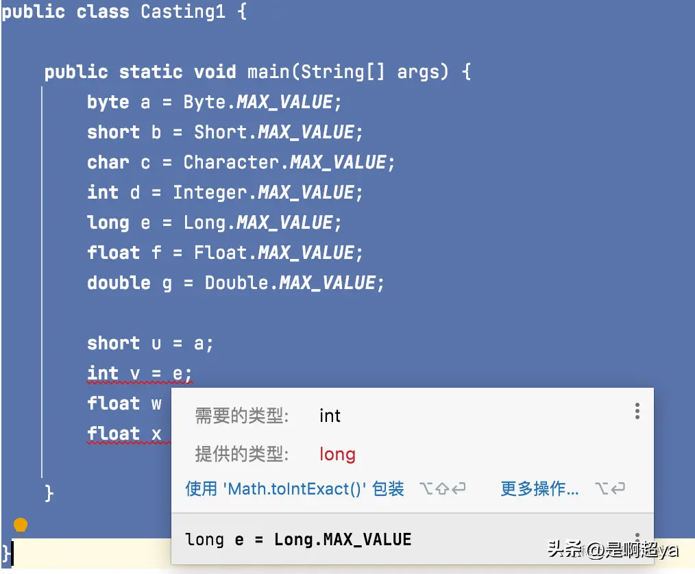 举个栗子,如果按自动转型规则进行类型转换就没问题,但是我们把 long 的值赋予一个 int(即高位转低位) 就会提示错误: