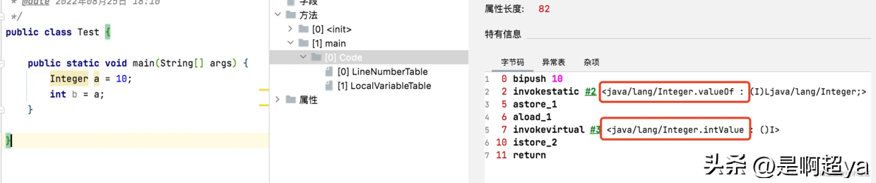 Integer a = 10; // 自动装箱 int b = a; // 自动拆箱以上代码查看字节码如下: