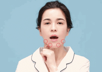 Step4:将Step1的手势平行移到两侧按压。在按压的同时,嘴巴张大分别做出“a”和“gu”的嘴型。左右两侧4点重复6次。如果感到疼痛说明淋巴处血液不流通,有老旧废质堵塞。