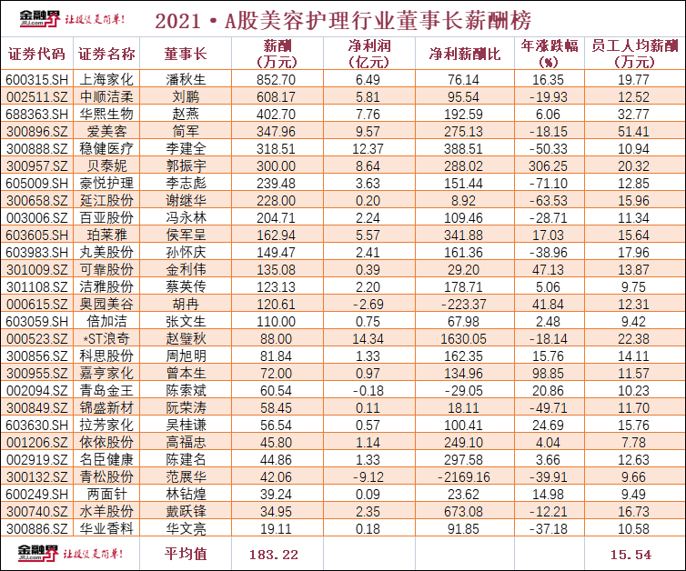导语:A股美容护理行业27家公布了董事长薪酬的公司中,的是上海家化潘秋生,年薪达852.7万元,中顺洁柔刘鹏608.17万元位列第二名,净利薪酬比方面,水羊股份董事长戴跃锋达到了673倍,稳健医疗李建全、珀莱雅侯军呈超过300倍。美容护理行业董事长平均薪酬达183.22万元,员工人均薪酬为15.54万元。
