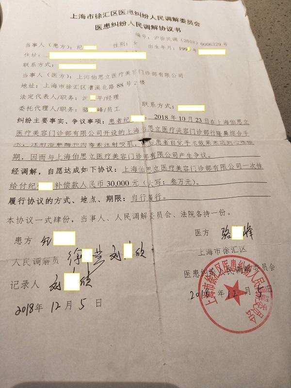 这位女士姓纪。一份盖有上海市徐汇区医患纠纷人民调解委员会公章的《医患纠纷人民调解协议书》载明,她于2018年10月23日在伯思立进行隆手术,注射容解酶和注射咬肌。“患者自觉手术未达到心理预期”后,与伯思立产生争议。经调解,伯思立一次性补偿纪女士3万元。