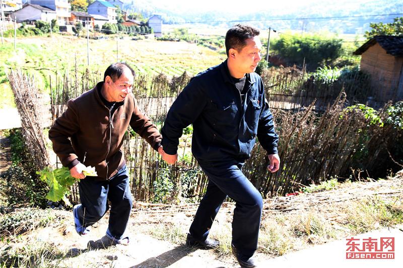 吴华辉(右一)拉着吕金生做户外锻炼。福建日报记者 郑雨萱 通讯员 李义友 叶凌云 摄