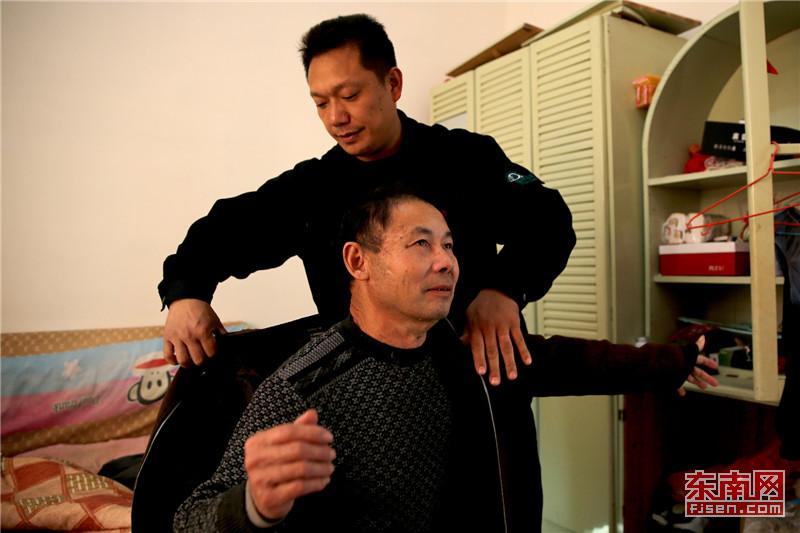 吴华辉帮助吕金生穿衣服。福建日报记者 郑雨萱 通讯员 李义友 叶凌云 摄