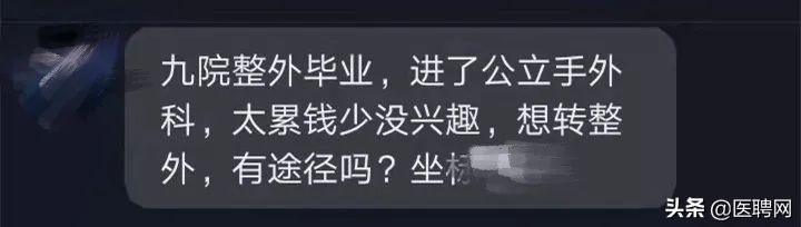 一位九院整外毕业的医生,原本起点极好,却进了公立手外科,工作数年后却发现钱少太累,自己也逐渐失去了兴趣,又想重新做回整外行业。