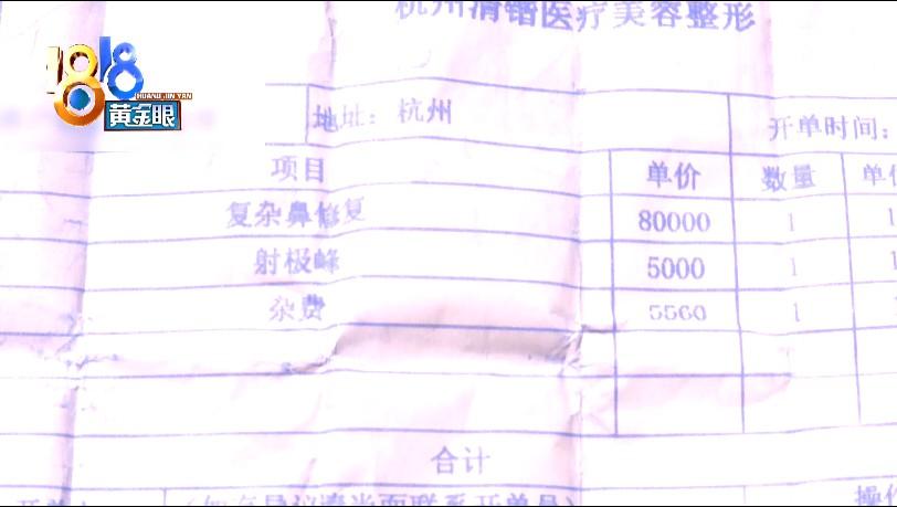 汪女士是从福建过来的,她告诉记者,之前做过隆鼻手术,后来出现了增生痘,鼻形也不是很好看,就在网上找到了杭州清锴医疗美容医院,打算修复。去年12月15号,她在杭州清锴医疗美容医院做了鼻修复、射极峰等项目,费用是八万零五百多块钱。