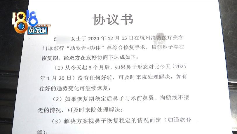 杭州清锴医疗美容医院 黄院长:“有协议的,你看很明确写的,2021年1月20号,从今天起三个月之后,没有任何好转,可及时来院去解决的(没有说要退钱)我们就是说,如果你到后期,实在实在,就是恢复稳定后,你要是不满意,再来院来协商,正常的恢复期起码是八个月到一年。”