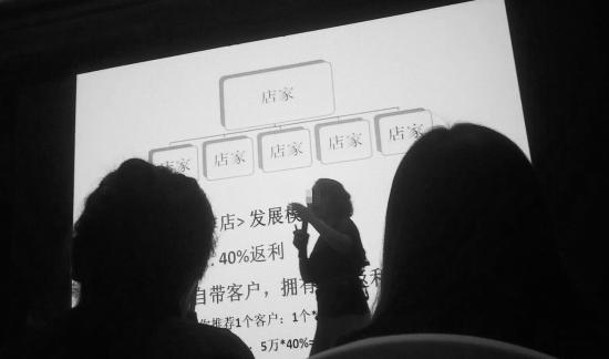 7月3日,长沙芙蓉路豪庭大酒店,禾丽医疗美容举行了一场“高峰论坛”,一名现场工作人员向与会者介绍提成模式。 图/潇湘晨报记者