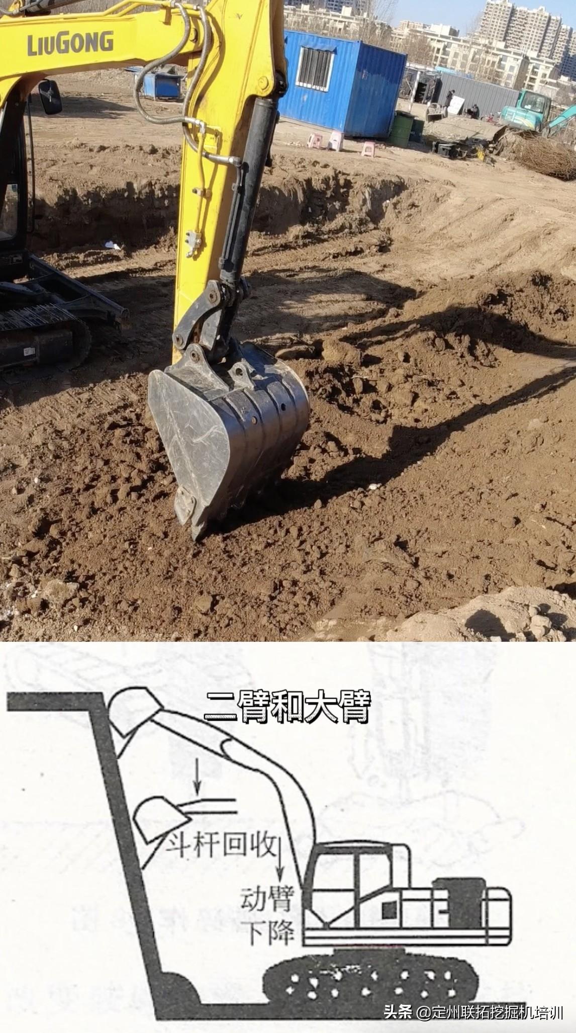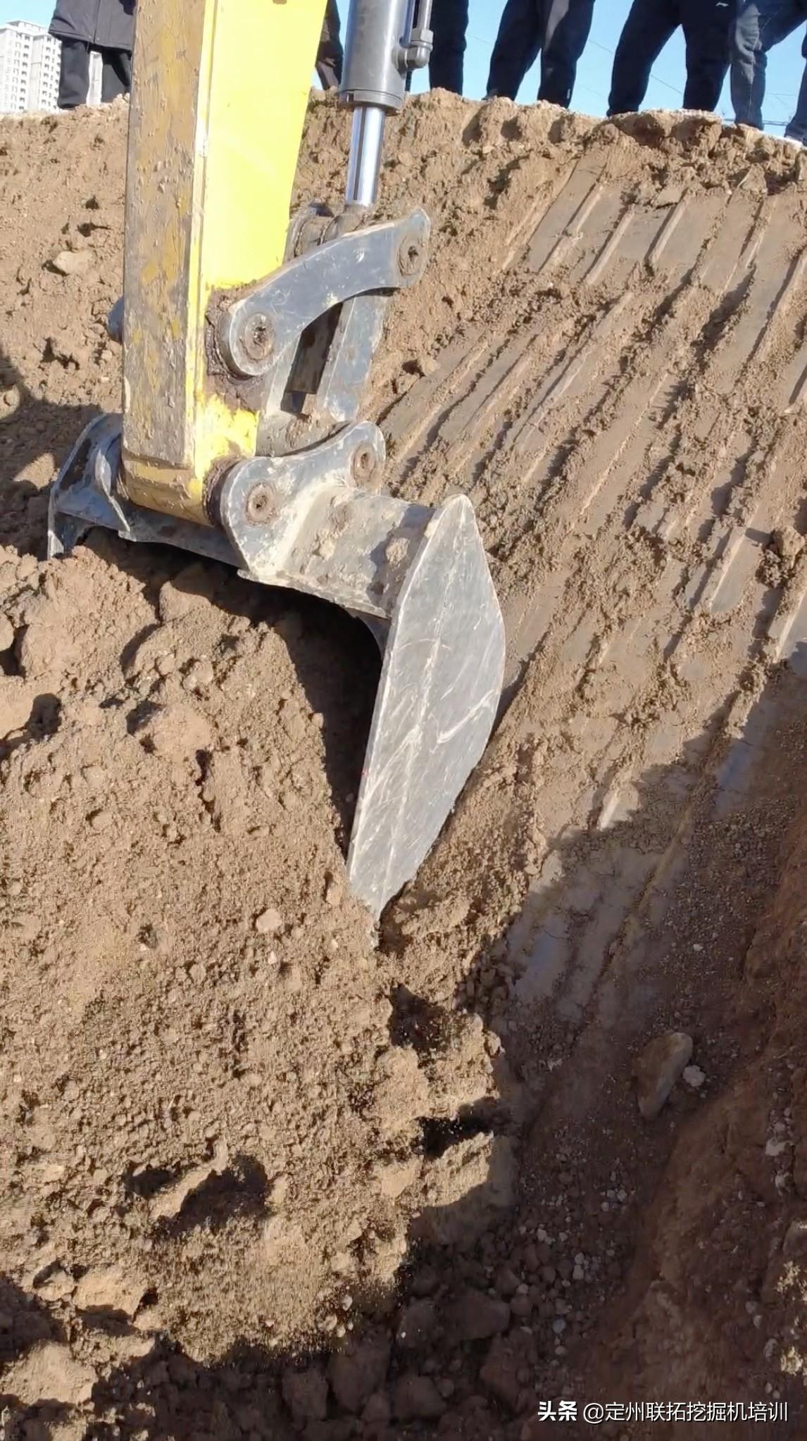 要鼓起来也不要凹进去,我们始终要保持上口线和下口线之间是一个斜平面,削好以后,我们在用挖机的斗背把斜平面蹭平就行了。