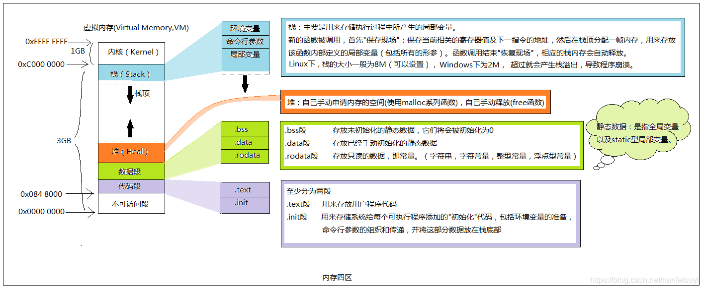 虚拟内存:操作系统为了更好、更地使用内存,管理内存,将实际物理内存进行了映射,对应用程序屏蔽了物理内存的细节,有利简化程序的编写。假设物理内存只有1G,有三个应用程序同时在运行,系统会将物理内存的一部分映射为3个大小均为4G的虚拟内存,让每一个应用程序都以为自己拥有4G内存(实际并不是,虚拟内存经过一定的方式映射为物理内存),这样极大地方便了应用程序的数据和代码的组织。