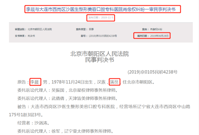 11月5日,李晨再度传来好消息,北京市朝阳区人民法院公布了《李晨与大连市西岗区沙医生整形美容口腔专科医院肖像权纠纷一审民事判决书》,裁判日期为2019年6月28日。