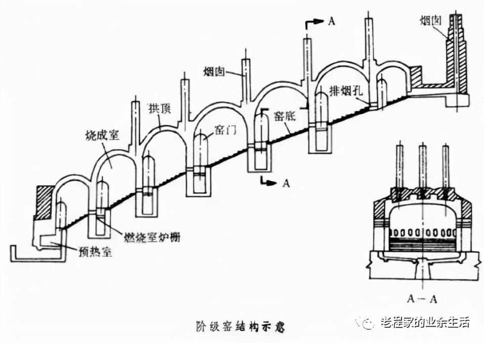 阶级窑——我国传统窑炉的一种形式。在坡地10度—20度倾斜度砌筑而成,窑长在15—30米之间,一般分5—10间窑室,以墙隔开,一室高于一室,有如阶级,故称阶级窑。室与室之间的墙下部有通火孔,火焰可依次通过各室,既可节省燃料,又可烧还原焰。阶级窑始于宋代的分室龙窑,完善于明代,早出现于福建地区,对GR窑的设计有很大影响。